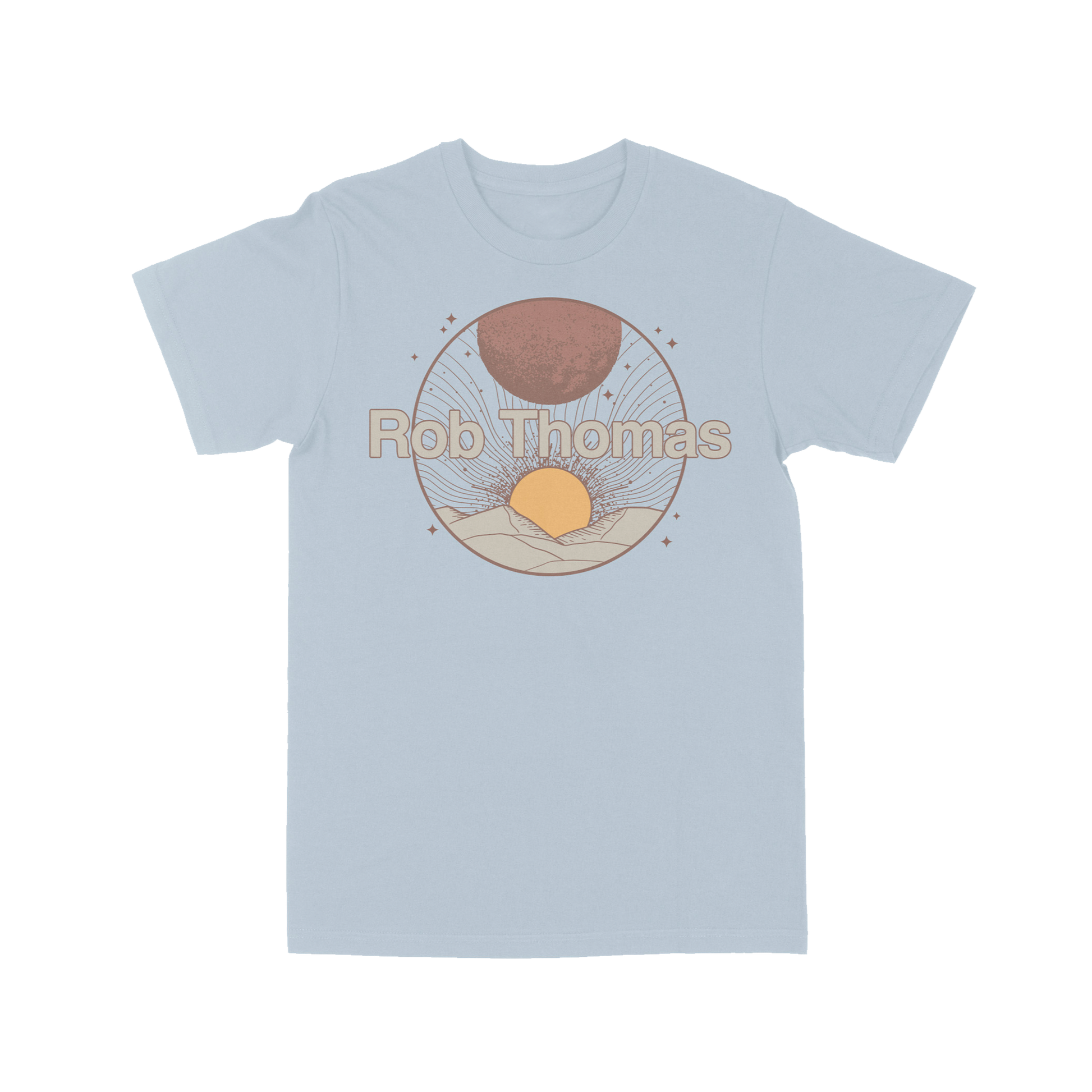 'Rob Thomas' desert sunset design printed on a 100% cotton light blue t-shirt.
