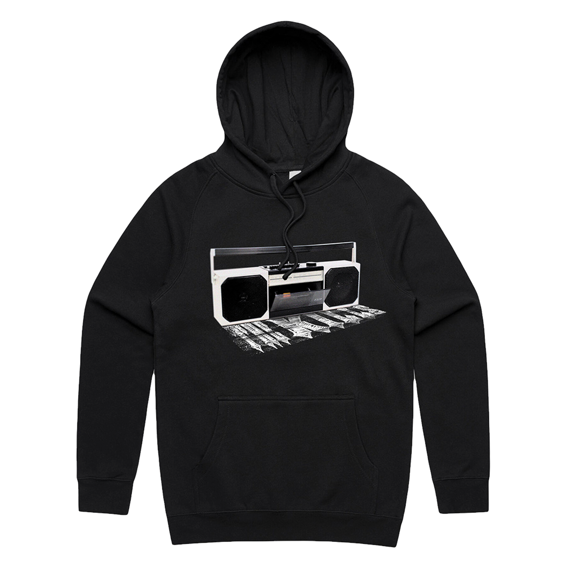 Boombox art printed on the front of a 80% cotton 20% polyester anti-pill CVC fleece hoodie.