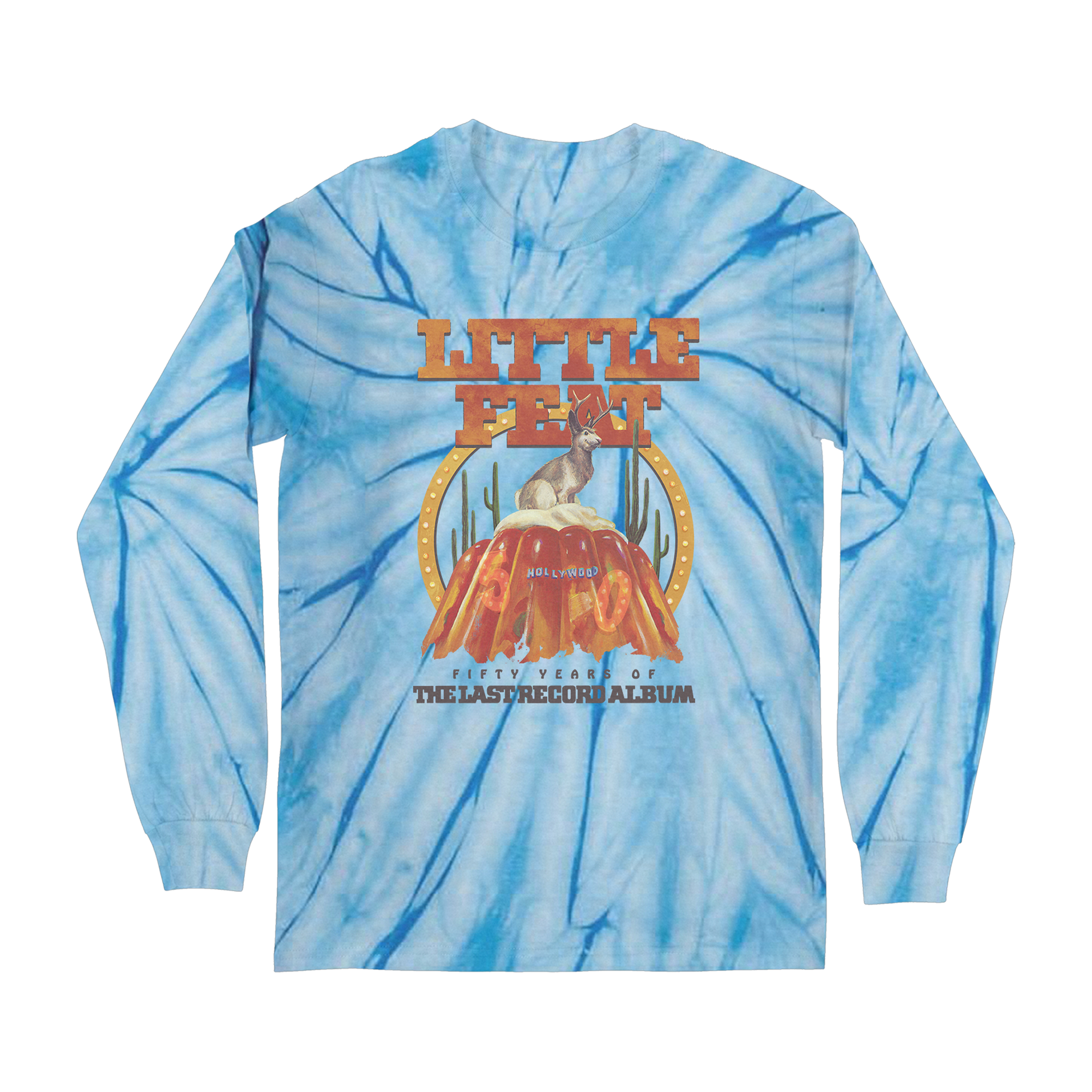 "Jello Mountain" design printed on a blue tie dye long sleeve t-shirt.