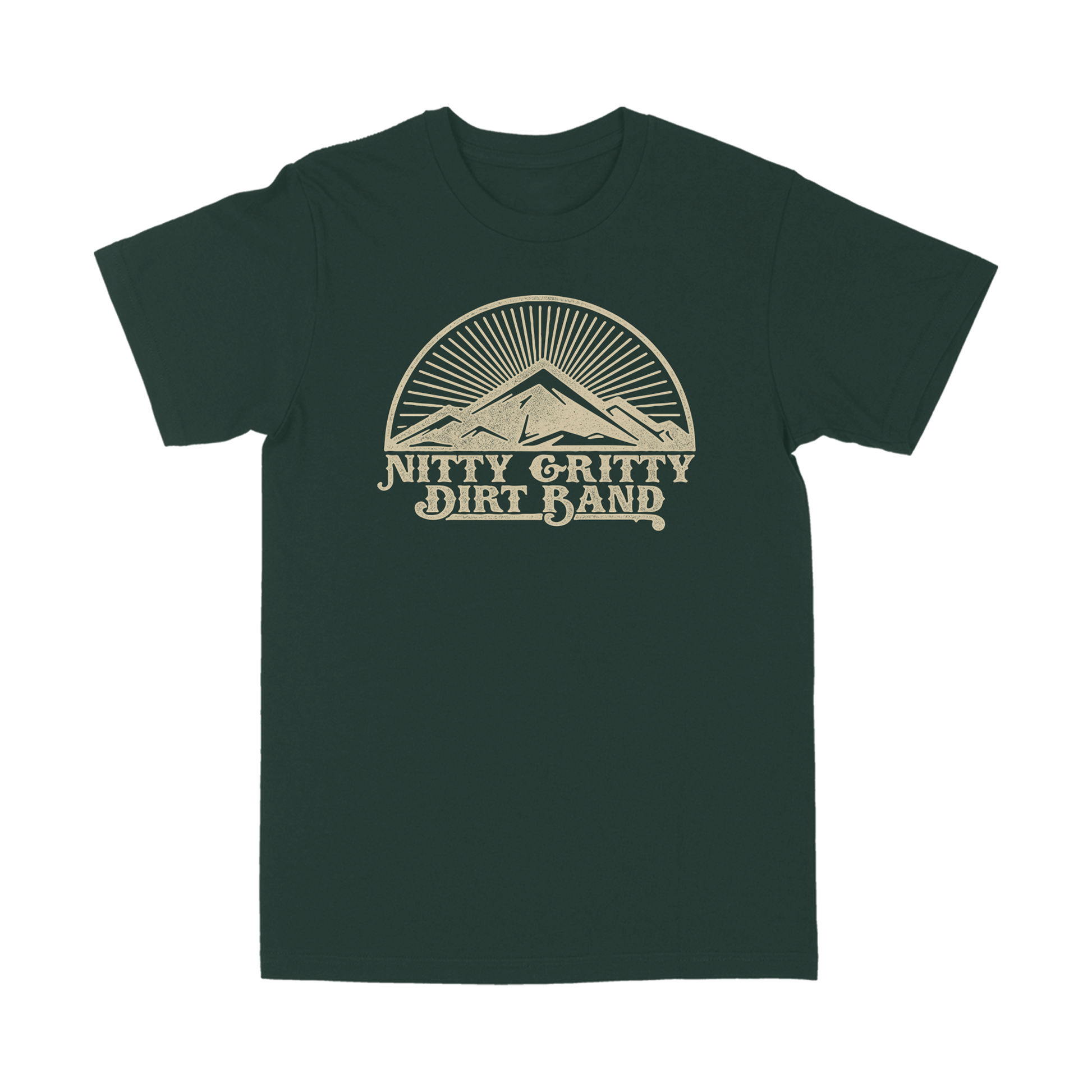"Mountain Sunrise" design printed on a green 100% ring-spun cotton t-shirt.