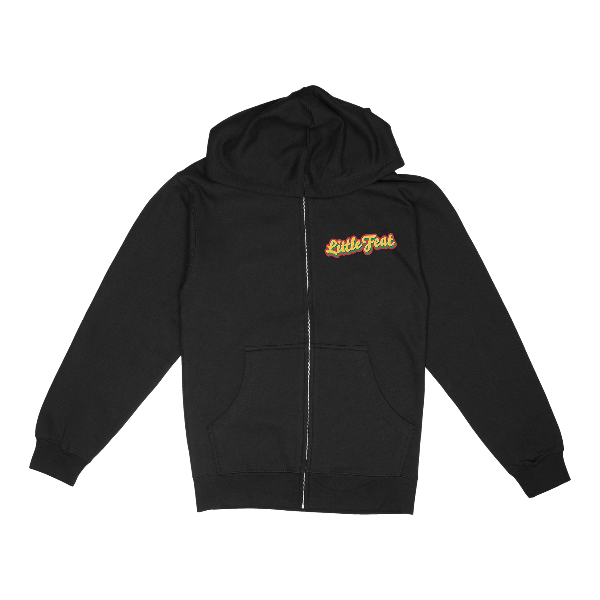 "Strike Up The Band" design printed on a black zip up hoodie.
